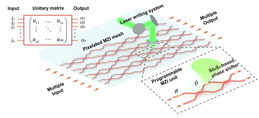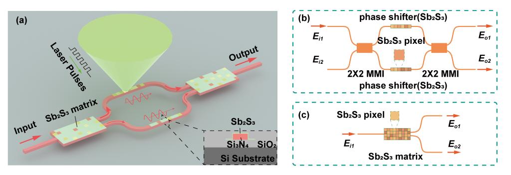论文提出了基于多级中间态相变材料的可编程光子芯片,包括马赫曾德尔干涉仪以及多模干涉耦合器。如下图所示,相变材料硫化锑薄膜沉积在波导以及多模干涉耦合器上。通过使用自由空间激光对不同的硫化锑像素进行多级调控,从而实现像素化相位调制以及可编程光子芯片。
