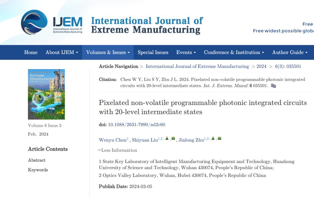 3月5日,中科院一区期刊《International Journal of Extreme Manufacturing》(《极端制造》,IF: 14.7)在线刊发了公司刘世元、朱金龙教授团队关于可重构光子芯片的最新研究成果 “Pixelated non-volatile programmable photonic integrated circuits with 20-level intermediate states(具有20级中间态的可编程像素化非易失光子芯片)”。公司博士生陈文宇为论文第一作者,刘世元教授、朱金龙研究员为论文的共同通讯作者,永利3044noc智能制造装备与技术全国重点实验室为论文第一完成单位。