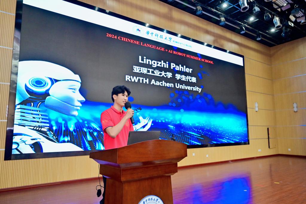 来自德国亚琛工业大学的Lingzhi Pahler作为员工代表发言,他表达了对华中大及暑期班全体师生的感激之情。在向大家展示了课堂上亲手制作的折扇和剪纸作品之后,他表示“这段经历让我深刻体会到了中国文化的博大精深和人工智能技术的无限可能。我会将在这里学到的一切带回德国,与更多朋友分享。”他的发言赢得了在场师生的热烈掌声。