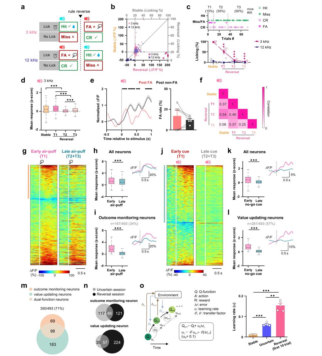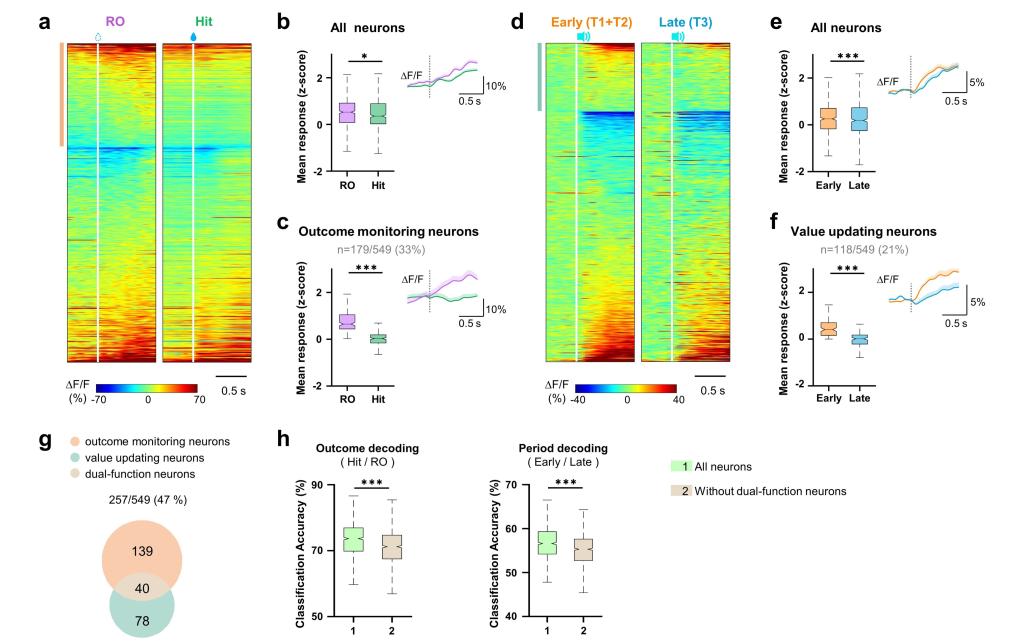 此外,本研究还通过强化学习算法(Reinforcement learning)估计不同刺激的激励值变化,探讨了在反馈驱动的价值迭代系统中,双功能神经元的募集如何形成一个非线性价值迭代系统来控制学习速率。结果表明在反向学习阶段早期的学习速率高于不可预测阶段并且模型预测的学习速率与双功能神经元的募集数量增加呈一致性,表明了这些神经元在价值迭代和决策转换中的重要性。这种动态募集机制使得大脑能够在保持决策更新的灵活性和稳健性的同时,实现快速的行为调整。