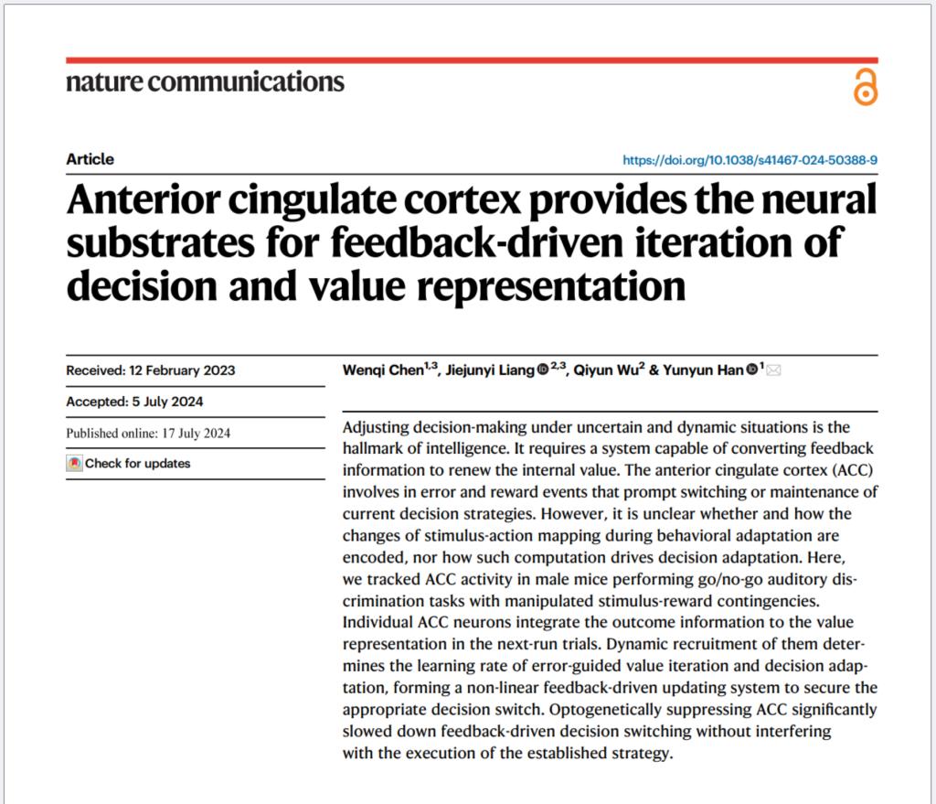 2024年7月17日,《Nature Communications》在线发表了公司题为“Anterior Cingulate Cortex Provides the Neural Substrates for Feedback-Driven Iteration of Decision and Value Representation”的最新医工交叉研究成果。本文针对大脑在适应不断变化的外界环境过程中,如何编码外界刺激与自身行为之间的映射关系,通过什么计算方式驱动最终决策的改变,以及如何复现这种认知计算能力等核心问题,建立了利用预期误差反馈改变决策习惯的生物认知行为模型,发现了平衡调节决策灵活性和稳定性的神经网络机制,为理解大脑高级认知功能及其复现提供了全新的认识和技术手段。