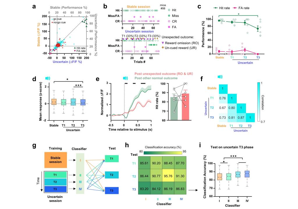 为实现以上目标,公司医工交叉研究团队与基础医公司神经科学研究团队共同展开大脑前扣带回皮层认知决策机制的研究工作。本研究通过使用双光子钙成像技术采集了大脑前扣带回皮层(ACC)兴奋性神经元的Ca2+动态活动。包括测试动物在进行感知辨别任务过程中经历稳定奖励、不可预测反馈和反转学习等不同任务阶段的神经活动,重点分析了刺激-奖励关联的反馈信息在神经元群体中的编码特征和转换规律。