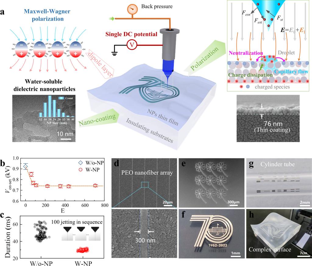 基于上述挑战,黄永安教授团队首创的极化驱动电流体喷印(PDE-printing)工艺,通过预涂覆介电纳米颗粒层(厚度低至76 nm),可在任意绝缘基板表面实现亚微米级分辨率喷印成形。借助于Maxwell-Wagner极化和纳米粒子间可能的隧穿效应,在涂层表面诱导出大量反极性电荷。局域极化电荷构建的电场大大降低了外加电压,并同步加速了残余电荷的消散。同时,纳米粒子涂层的毛细管效应可有效锚固液滴,从而进一步实现在各种绝缘3D基底上微纳结构的高精度打印(分辨率可至300 nm)。