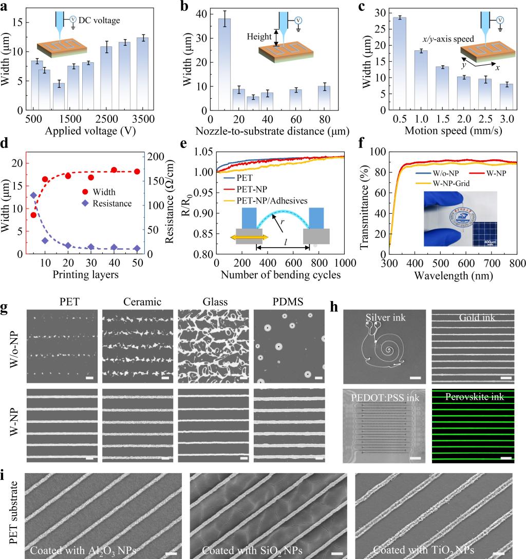 通过调节关键参数可实现功能结构按需喷印制造,并验证了介电纳米涂层的界面粘附性、透光性,以及基板材料、纳米颗粒材料的兼容性,发现与多种单纯绝缘基板表面无序的打印结果相比,在带有纳米涂层的绝缘基板表面打印效果得到大大提升,可实现稳定的高分辨率喷印制造。