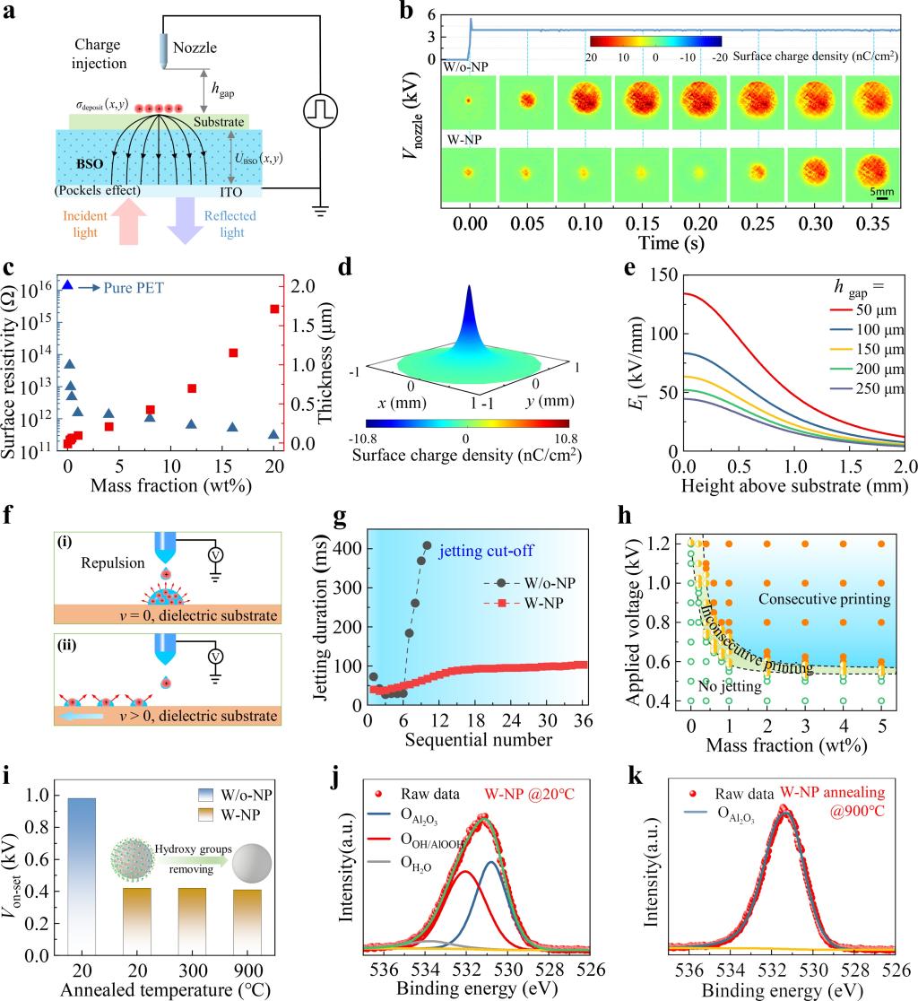 具体而言,在PDE-printing工艺中,基底置于喷嘴下方,对喷嘴施加直流高电压,而无需像传统EHD喷印技术配置接地电极,大大简化了喷印系统组成。在外部电场E0作用下,基底表面纳米粒子层会发生界面极化,进而在喷嘴下方产生一个虚拟电极。极化产生的电偶极子相应地会在表面产生了局部电场 EI。因此,叠加电场E成功地触发了电流体动力现象,实现了高精度泰勒锥喷射。与传统EHD喷印工艺相比,PDE-printing工艺存在多个明显优势:(1)电场聚焦使高分辨率EHD打印工艺不再受基板几何形状或尺寸的限制,(2)大大降低打印所需的外加电压(最大降幅为58%),(3)局域极化电荷促进了墨水残余电荷的耗散,确保了射流稳定喷射。