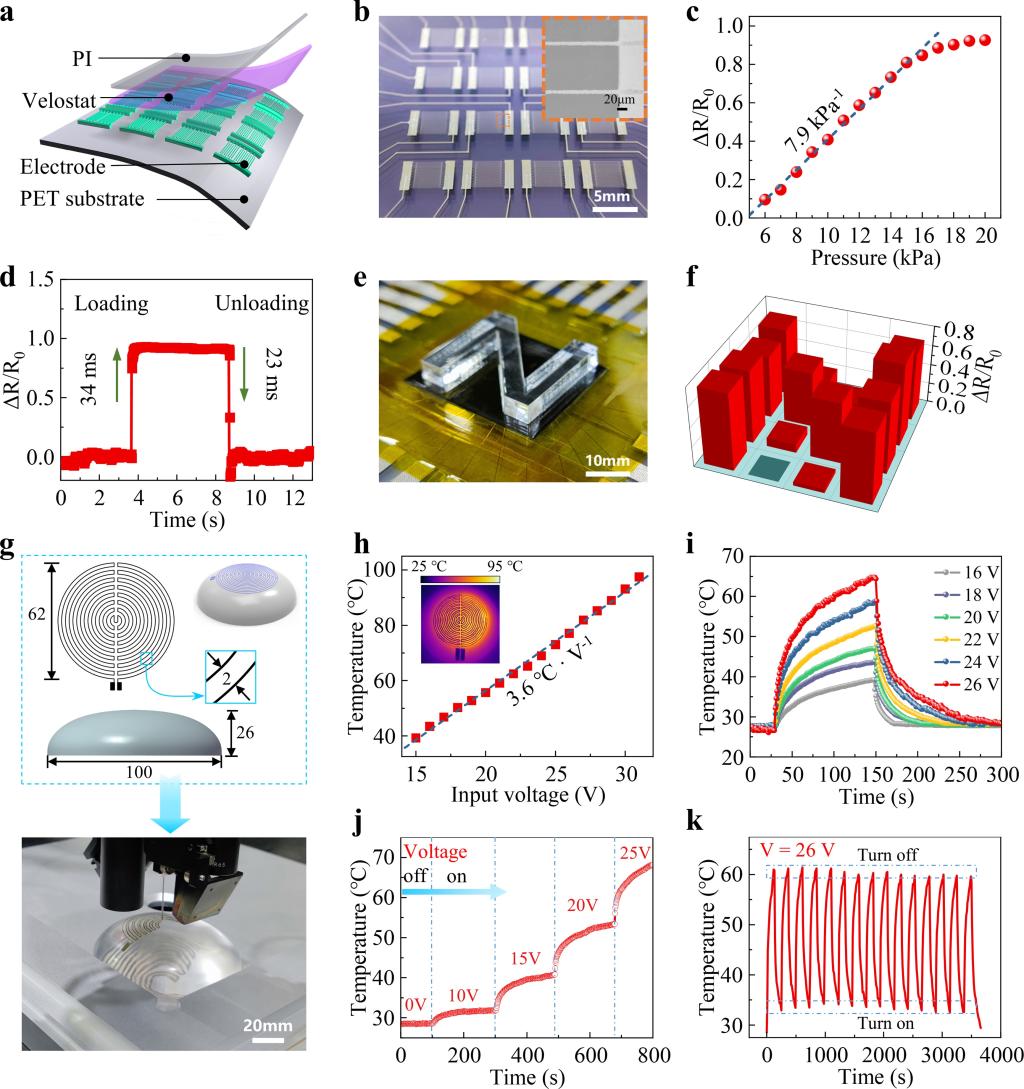 设计并制造了柔性和曲面电子器件来验证工艺的应用潜力。利用PDE-printing工艺制造了像素尺寸为5.8 mm × 3.5 mm 的4 × 4柔性压力传感器阵列,根据压力分布获得了清晰的形状映射。在直径为10 cm的球冠上打印了共形曲面加热器,在不同电压下得到约3.6 ℃/V 的良好的线性响应。