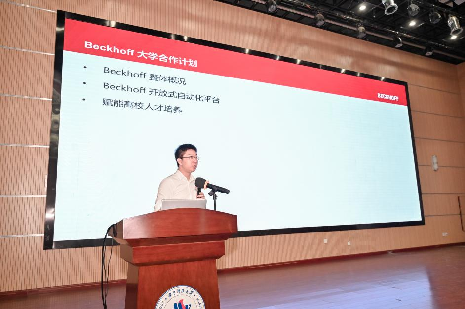 倍福中国数据科学与工程部经理华长盛博士做了题为”倍福大学合作计划丨开放式自动化平台赋能高校人才培养“的报告,介绍了倍福公司依托开放式自动化硬件和软件平台,与高校合作搭建实践创新平台,开展实践教学资源建设和员工实习实践活动的经验,以及依托大学计划进一步推进在校师生参与企业实践和德国研学的设想。