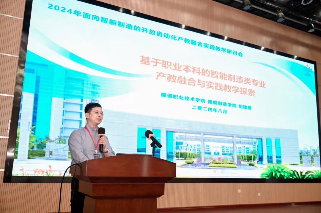 顺德职业技术公司智能制造公司副经理胡建国教授做了题为“基于职业本科的智能制造类专业产教融合与实践教学探索”的报告,分享了整合跨学科资源开展智能制造公司建设的整体思路,以及依托广东智能制造产业优势,开展产教融合实践教学的具体措施和成效。