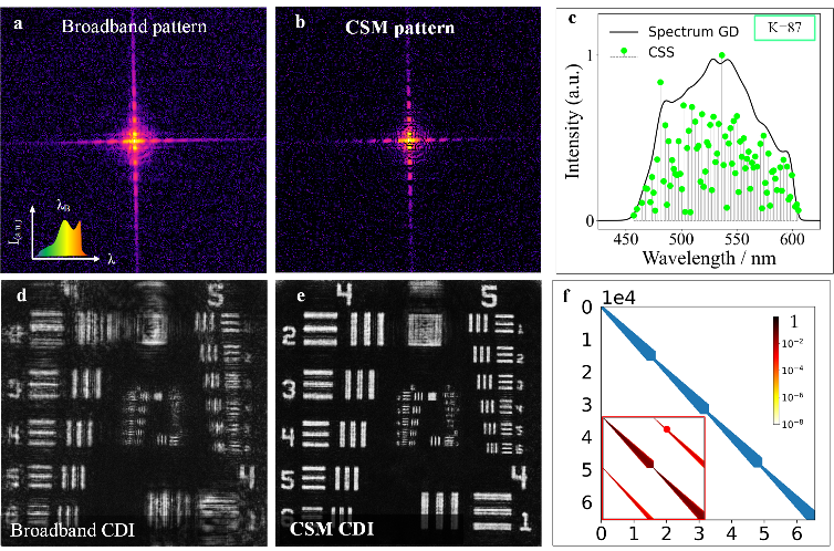 研究团队针对BCDI技术中所存在的成像系统光谱特征信息测量问题和宽光谱衍射信号退相干问题,提出了一种“光谱原位测量-稀疏光谱采样单色化”的超宽光谱相干衍射成像全新范式,可同时获得无先验光谱信息条件下的超宽光谱相干衍射计算成像和成像系统光谱特征的原位测量。