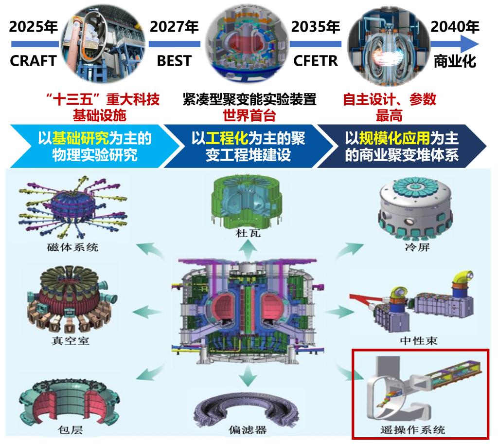 作为新质生产力的重要一环,可控核聚变是一种颠覆性的能源技术,被视为人类能源的“终极答案”。作为我国核能发展战略的“三部曲”(压水堆-快堆-聚变堆)的最后一步,聚变堆的研发与建设对于推动全球能源革命具有重大意义。目前,我国在核聚变领域的研究已走在世界前列,特别是在物理实验研究和聚变工程设计方面取得了显著成就。为加速聚变工程的商业化进程,在吸收消化设计基础上,我国于2017年自主设计了中国聚变工程实验堆CFETR(Chinese Fusion Engineering Testing Reactor),开展我国聚变工程实验堆的集成设计及其关键技术的研发,旨在全面掌握下一代聚变堆的设计与建造技术。为保障CFETR在2035年前顺利建成,合肥中科院等离子所于“十三五”期间牵头研发了聚变堆主机关键系统综合研究设施(CRAFT),旨在构建国际核聚变领域参数最高、功能最完备的综合性研究及测试平台,用于支持超导磁体、聚变堆真空室、遥操作系统等核心技术攻关和关键设备研发。