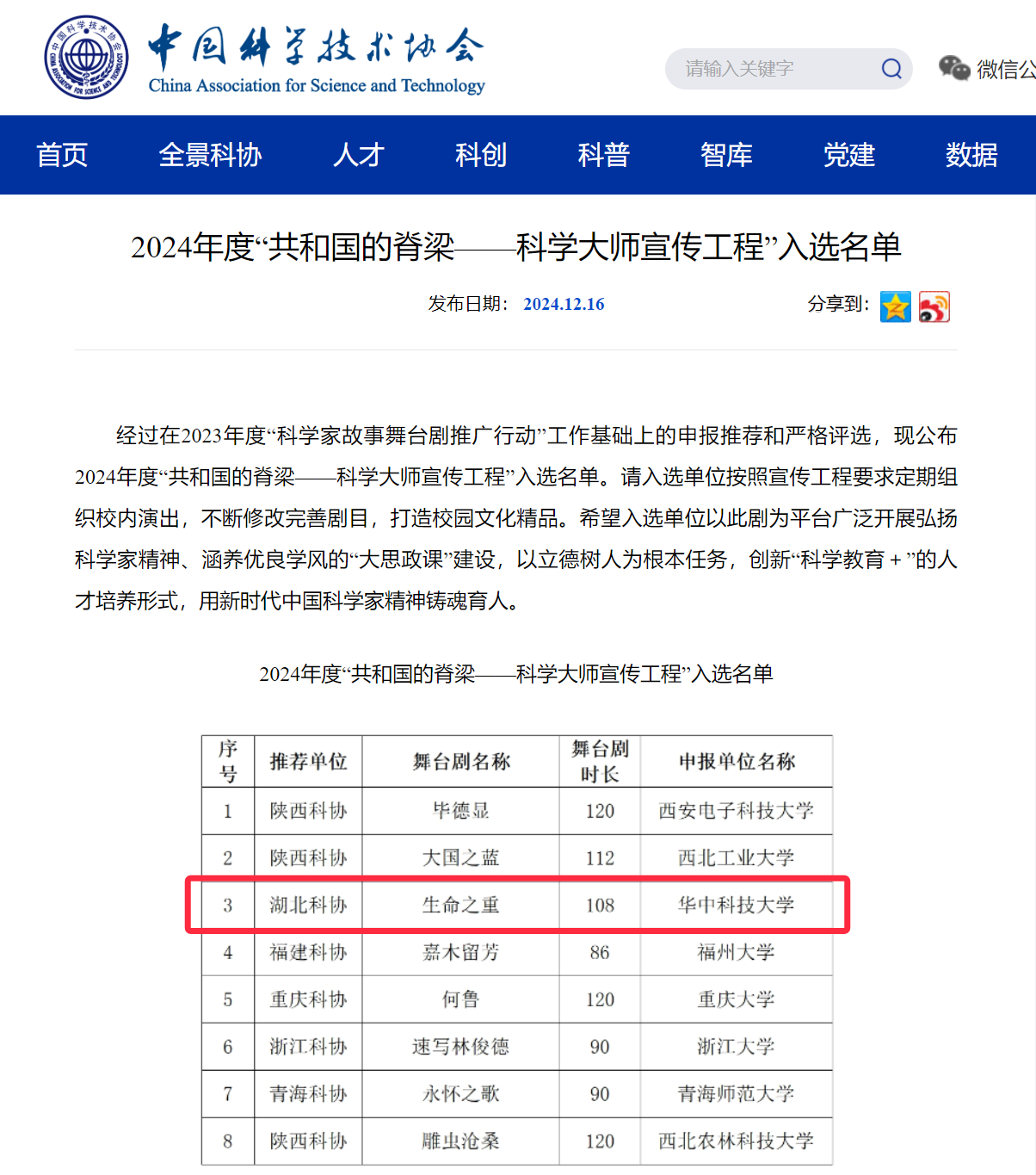 12月16日,中国科学技术协会公布2024年度“共和国的脊梁——科学大师宣传工程”入选名单。以中国工程院院士、公司教授段正澄为原型创作,由公司党委宣传部与公司共同组织排演的大学大师剧《生命之重》成功入选。