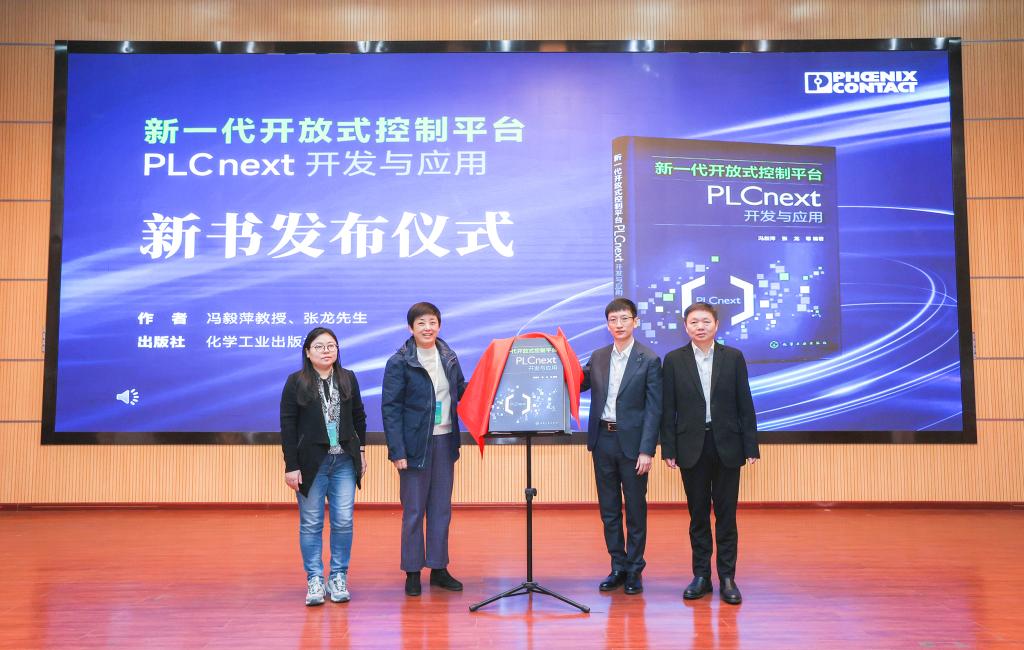 在EduNet年会成果发布环节,举行了《新一代开放式控制平台-PLCnext 开发与应用》新书揭幕,创作团队浙江大学控制科学与工程公司冯毅萍教授、菲尼克斯电气中国公司张龙先生、化学工业出版社郝英华编辑介绍了该书的创作背景和主要内容。
