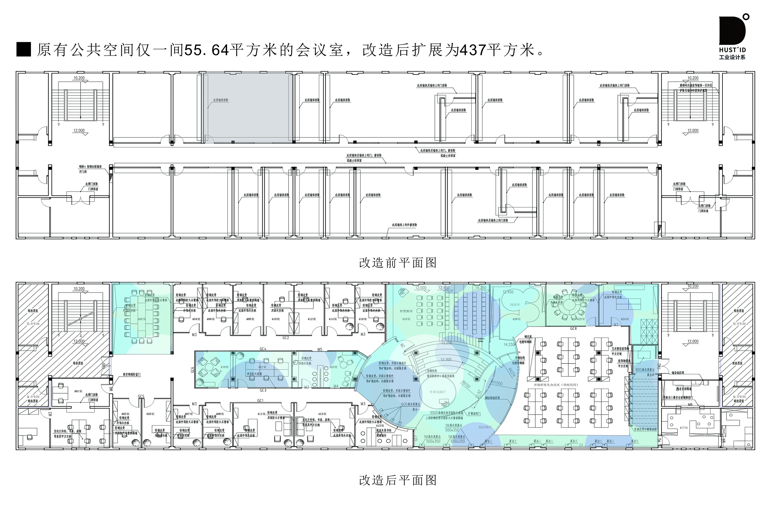 东一楼,作为一座历史文化建筑,于1956年落成。然而,随着公司师生创新需求的不断增长,该建筑的原有教学空间逐渐显露出功能单一、空间利用率不足等诸多问题。为解决这些问题,设计团队对东一楼四楼进行了全面的功能分区与空间重组。历经两年半的精心打磨,基于对公司STAR文化不断深化的理解与剖析,设计团队对设计方案进行了多次重大迭代,将原本封闭、单一的空间成功转化为开放、共享的创新环境。“以公司STAR文化引领和师生需求为导向”的设计理念,不仅满足了新时代专业建设与高质量美育活动策划的需求,更为跨学科交流和创新思维碰撞提供了理想的平台。