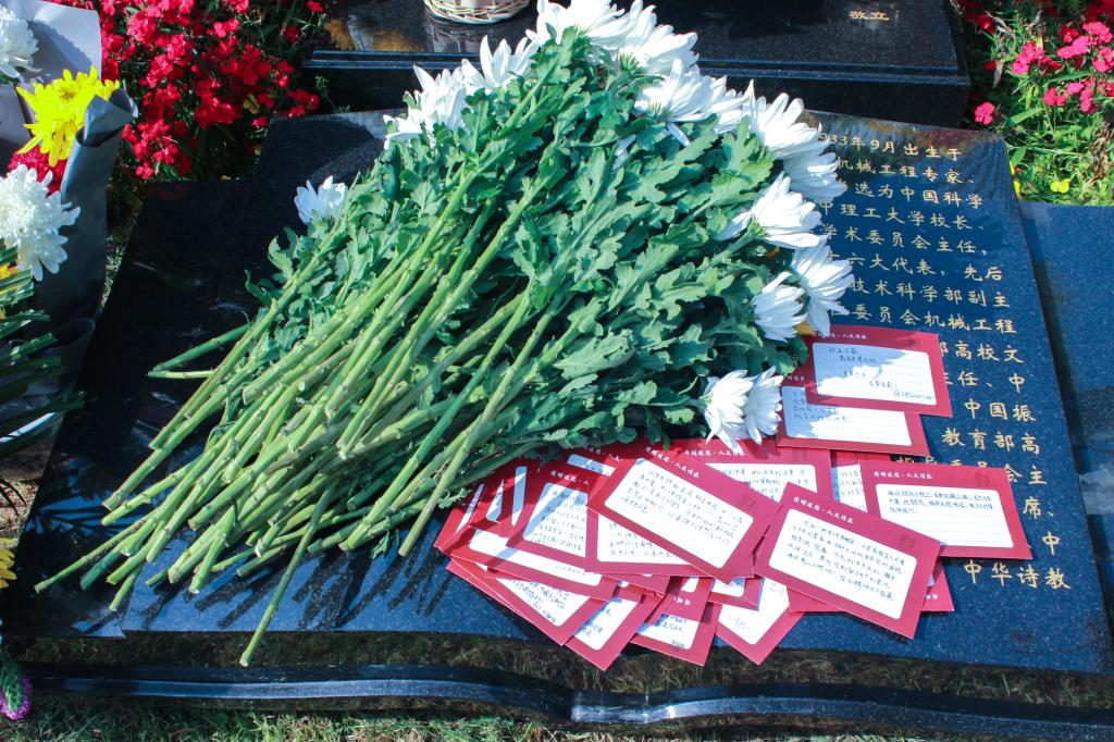 最后,师生们向杨叔子院士敬献花篮,每名同学都手持白菊,将写满寄语的卡片,轻放在杨叔子院士的纪念像前。卡片上既有对院士的追思,也有员工们立志学习、报效国家的承诺。公司博士生徐文韬的卡片上写着“珠玉在前,瓦石更需自砺”;附小五年级员工朱沛灵的卡片上,画着齿轮与诗句交织的图案,并写上“敬爱的院士爷爷,我们会接好科学报国的接力棒”。