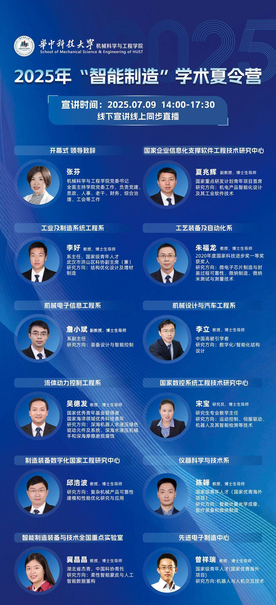 随后,国家企业信息化应用支撑软件工程技术研究中心夏兆辉副教授、工业工程系李好教授、工艺装备及自动化系朱福龙教授、机械电子信息工程系詹小斌副教授、机械设计与汽车工程系李立教授、流体动力控制工程系吴德发教授、国家数控系统工程技术研究中心宋宝研究员、制造装备数字化国家工程研究中心邱浩波教授、仪器科学与技术系陈韡教授、智能制造装备与技术全国重点实验室冀晶晶教授、先进电子制造中心曾祥瑞教授,以及医疗装备科学与工程研究院赵精晶教授,分别就各个系/中心/研究院等的基本情况、导师团队、实验室资源、科研成果、招生需求,以及毕业生去向等方面进行了详细的介绍,用“干货”满足了学子们对各个专业方向的好奇心。