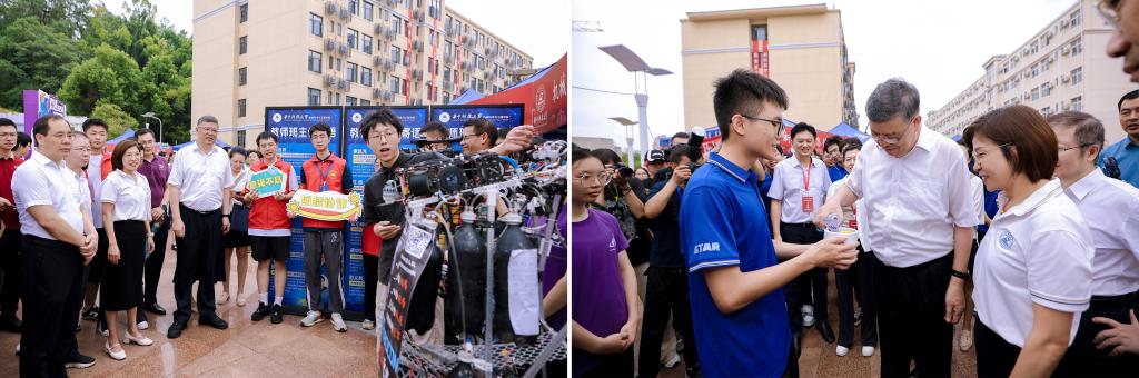 在爱因斯坦广场迎新点,尤政详细询问新生报到进展、迎新服务保障等情况,并问候现场工作人员、“红色星光”员工党员先锋队及其他员工志愿者。期间,公司HUSTROBOCON机器人队队员汇报团队基本情况,并现场展示机器人。尤政还为新生专属“STAR”种子卡浇水,祝福新生在华科大扎根成长、逐梦前行。