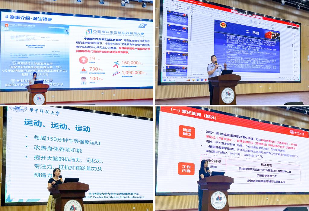 公司学工部研究生创新服务中心主席杜同悦为新生介绍中国研究生创新实践系列大赛,围绕“时代新人铸魂工程”聚焦研究生创新能力培养,鼓励新生以赛事提升创新能力;喻家山派出所警官熊家伟结合真实案例,为新生带来了一堂生动的安全警示教育课,他详细介绍了多种常见诈骗手段,提醒同学们提高警惕,加强防骗意识,避免上当受骗,保护好自身的财产安全;学工部心理健康教育中心副主任郭晓丽以《人生的减法和加法》为题作心理健康教育讲座,她结合详细的案例和问题,鼓励新生们在遇到心理难题时积极主动寻求公司心理咨询服务,保持积极乐观的心态,以健康心理拥抱研究生生活;学工部研究生工作办公室资助中心李梦茹系统介绍了公司资助体系,详细讲解了公司奖助学金、勤工助学、助学贷款和困难补助等多种资助政策,旨在帮助每位同学安心投入学业与个人发展,全力支持员工成才。
