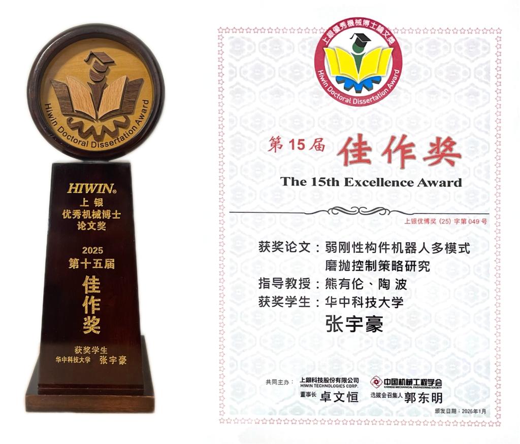 由熊有伦院士、陶波教授指导,2024届博士毕业生张宇豪博士学位论文《弱刚性构件机器人多模式磨抛控制策略研究》荣获佳作奖。