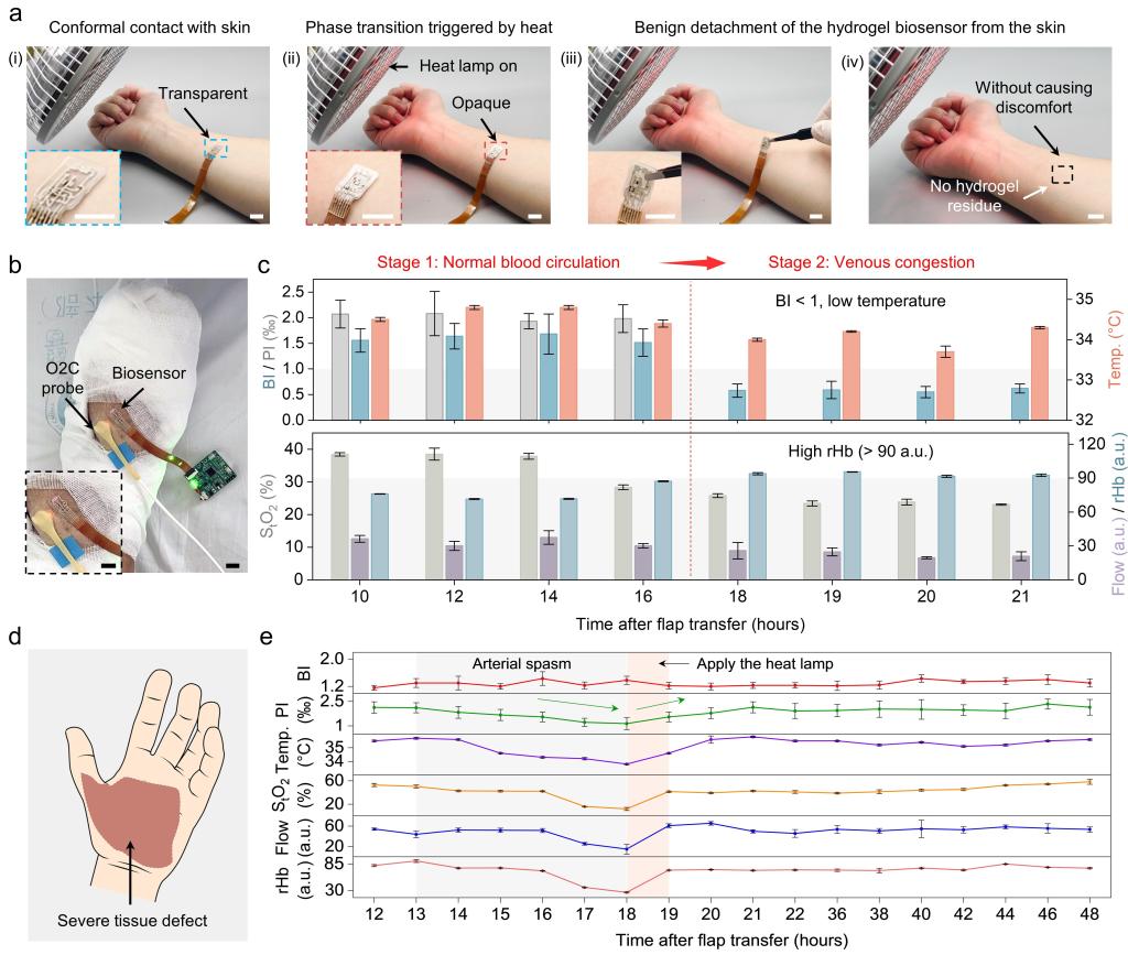 将该传感器应用于术后游离皮瓣的血液循环监测时,其可与术后皮瓣紧密黏附以实现光电容积脉搏波(PPG)及温度信号的高质量采集,监测完成后可通过热触发实现其与皮瓣皮肤的温和剥离以避免组织损伤。研究团队基于PPG信号的形态学分析,提出了血运监测新指标,即平衡指数,实现了对静脉血运障碍的定量化检测。该传感器通过同步监测平衡指数、灌注指数及皮肤温度,可实现不同类型血液循环并发症的精准检测及区分,优于临床评估及现有血运监测技术(O2C系统)。