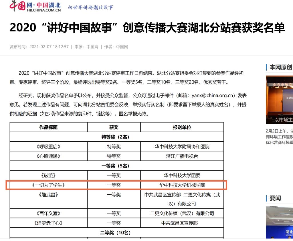 此外,由校团委制作拍摄,以公司员工为原型的作品《破茧》也获得2020“讲好中国故事”创意传播大赛湖北分站赛一等奖。