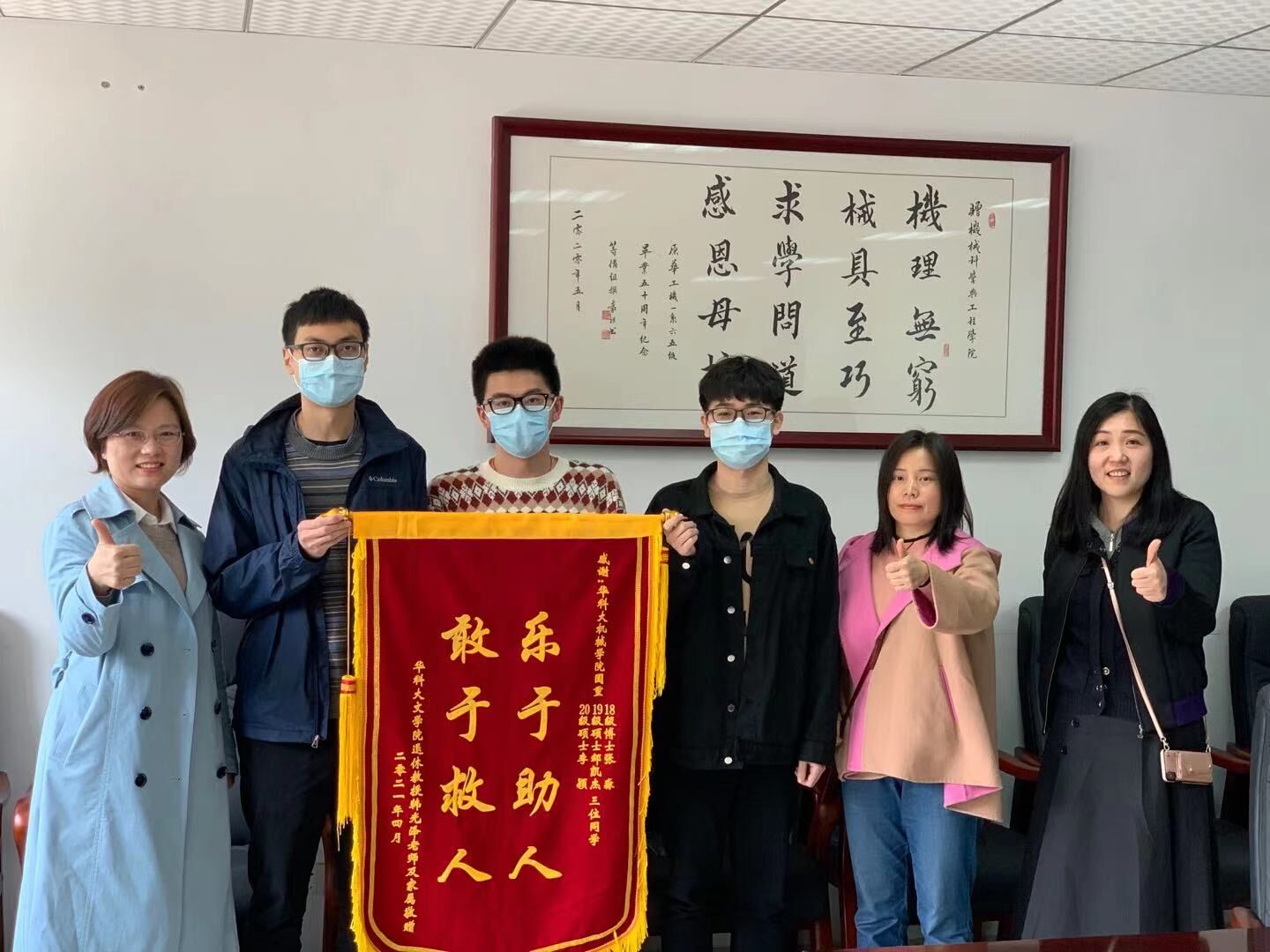 4月9日下午,公司文公司82岁退休教师韩光泽的家属来公司寻找见义勇为、乐于助人的三名研究生,对他们在危难之际伸出援手,护送家父就医的正能量行为表示感谢,并赠送锦旗。