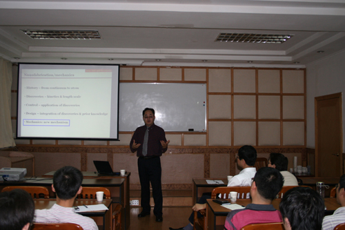 讲座中,黄汉臣教授首先概括介绍了康涅狄格大学工程技术实验室的机构与人员组成、研究领域及主要研究成果,然后从动力学约束的纳米材料加工技术的提出、仿真、实验和应用及其对当今科技发展影响等方面进行了详细阐述。黄教授强调指出,当前世界面临能源危机,迫切需要解决的是能源的可持续发展问题,而纳米材料加工技术是一种新的机械制造加工技术,也是一种非常重要的解决能源问题的方法。