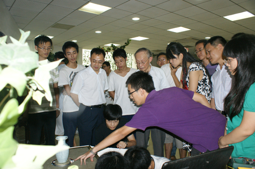 比赛采用PPT汇报、评委提问与实物展示相结合的方式。杨院士饶有兴趣地参加了比赛的实物展示环节,一一参看了各参赛队伍的作品,并拿起了作品虚拟健身系统包含有传感器的乒乓球拍,实际感受微传感器给现代生活带来的便利。参加完实物展示之后,杨院士应邀做了讲话,并指出“微纳”、“传感器”、“应用”、“装置”是本次大赛的关键词,强调了微纳传感器在现代生活中的应用价值,并鼓励在校老员工多参加此类的创新大赛。