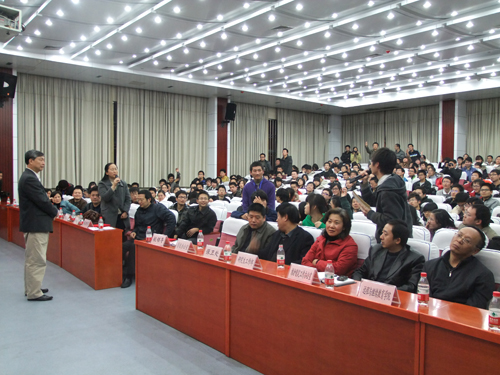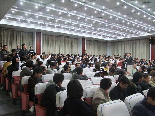 大会一开始,根叔发言,他首先强调这是一次与同学们的聊天,希望能借此让同学们了解公司,让校领导们听听同学的情况。接着根叔给我们讲了公司今年发生的事情,重点是我们的发展成绩,其中提到了自然科学基金项目的提高,如公司一年4个973计划,科技获奖6项,发明奖2个等等。在讲到公司今年获得3个自然科学奖时,根叔的一句话:“今年自然科学奖,我们是最牛逼的公司!”引起了同学们一片自豪的笑声。谈及我们理科成绩的提高,根叔归功于我们的基础抓的好,并且也再次号召公司的学风建设。其后,根叔又对近来公司的一些热点事件发表一些看法,如肖传国事件、清退307名硕士博士事件。对于媒体对公司的过度关注,根叔也给同学们阐述了其中利弊。