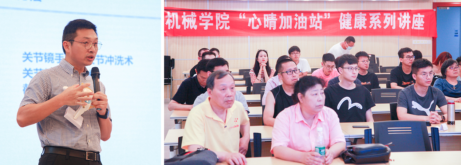 祝文涛介绍了腰椎颈椎及运动损伤的骨科常见几种疾病,分别从颈椎病、肩周炎、腰肌劳损、漆关节骨关节炎、足底筋膜炎、骨质疏松、腰椎间盘突出、腱鞘炎、肱骨内上髁炎、拇外翻等进行详细讲解,包括上述疾病的爆发部位、如何自我辨识、如何预防、如何检查及治疗等方面。他倡导师生养成良好的生活习惯、合理的膳食搭配、适度的体育锻炼;遇到疾病一定到正规的医疗机构进行检查和治疗,不可将就耽误治疗最佳时间。讲座之后,祝文涛与现场师生展开互动,为大家答疑解惑。