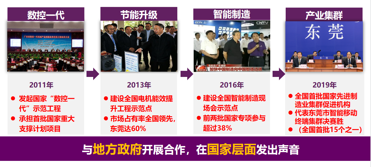 创立之初,广东工研院便通过革新技术手段,支撑东莞乃至广东的毛纺、家具、模具等支柱产业创新发展。从2011年先后牵头发起了国家数控一代机械产品创新应用示范工程、建设了全国电机能效提升示范点、建设了国家首批智能制造示范点并被选为交流会唯一示范现场,到2021年代表东莞市智能移动终端集群决赛胜出(全国首批15个之一)。广东工研院已经推动东莞乃至广东的产业转型升级达十年之久,成为地方推动产业转型升级、实现社会经济高质量发展的重要力量。