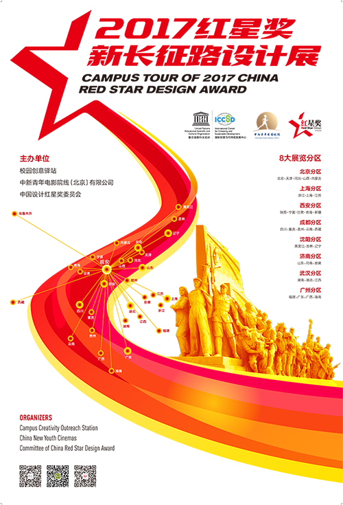 “2017红星奖新长征路设计展”由中国设计红星奖委员会、校园创意驿站与中新青年电影院线(CNYC)联合主办,旨在通过对优秀创意的展示、好设计产品的体验互动,启发青年人的创造性思维。展览以重走长征路的形式,在北京、上海、西安、武汉、成都、沈阳、济南、广州8个分区举办,覆盖全国300所以上高校。展览带着工业、建筑、文化、可持续等领域的优秀创意作品走进校园,走近青年,在丰富校园文化生活的同时,激发青年们的创新热情。