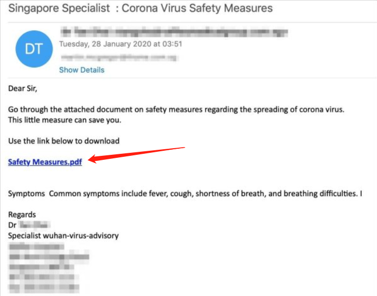 黑客冒充疾病防控中心或病毒专家,实施网络钓鱼攻击,以“提供周围区域的感染列表”、“提供冠状病毒预防文档,请下载附件”等标题为掩护,发送电子邮件,诱骗受害者点击邮件中的钓鱼链接,窃取个人信息。