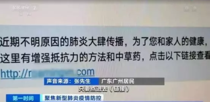诈骗分子群发短信,声称有抵抗新冠肺炎的良方,并在短信中放入钓鱼网站的链接,诱导用户点击查看或购买。