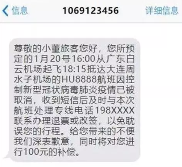 诈骗分子以“航班取消,办理退改签可获赔偿”为由,诱导受害人拨打短信中的电话,套取银行卡号、密码等重要信息,盗刷银行卡。