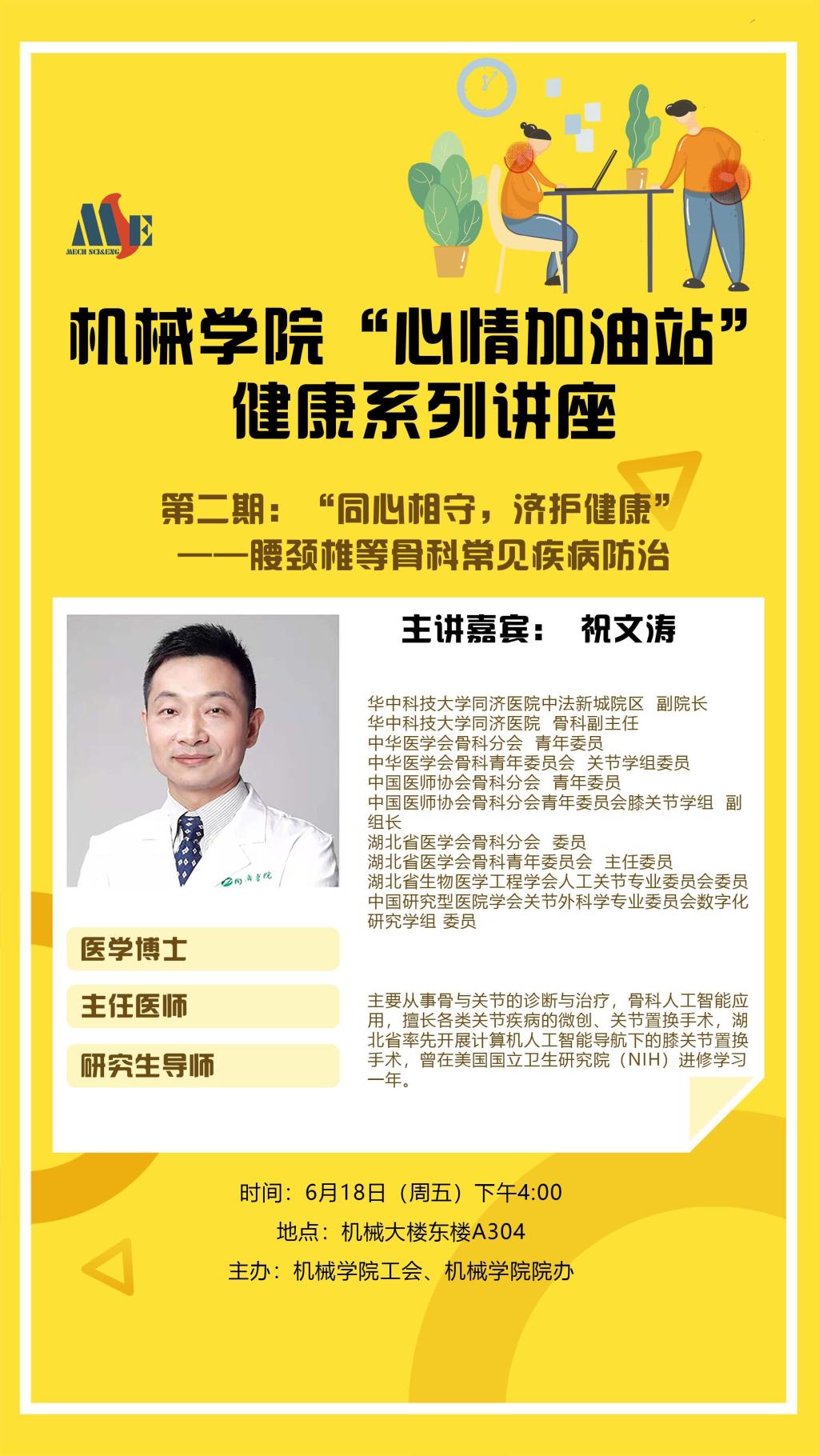 此次邀请了同济医公司中法新城院区副经理、同济医公司骨科副主任祝文涛为大家讲解腰颈椎等骨科常见疾病防治的相关知识,欢迎广大师生届时积极参加!