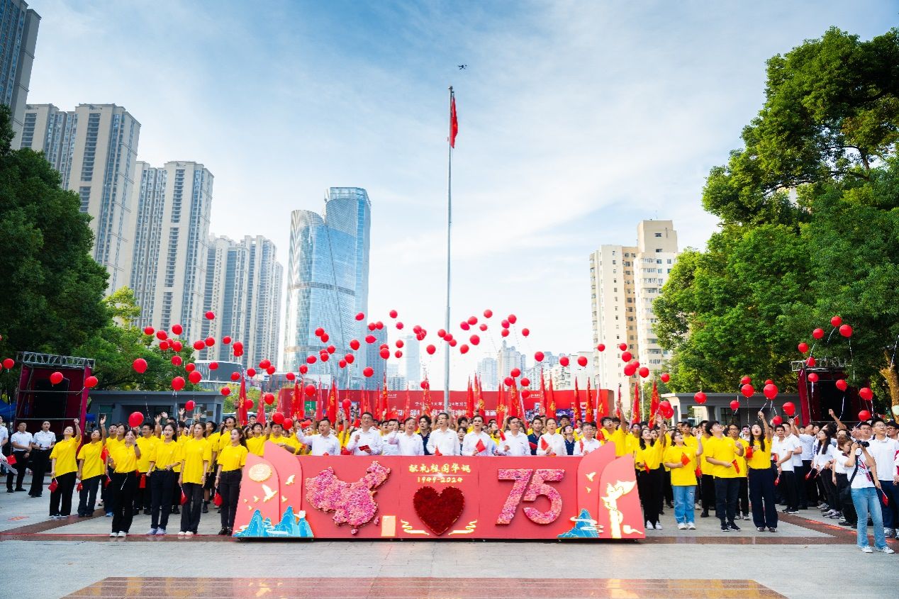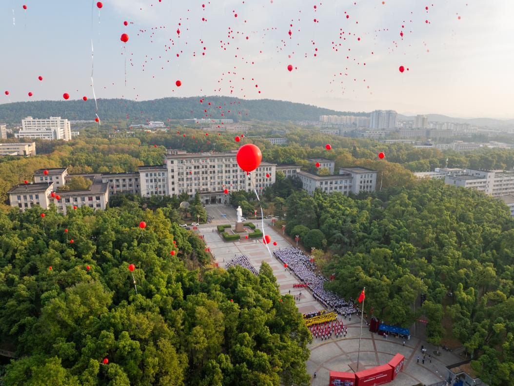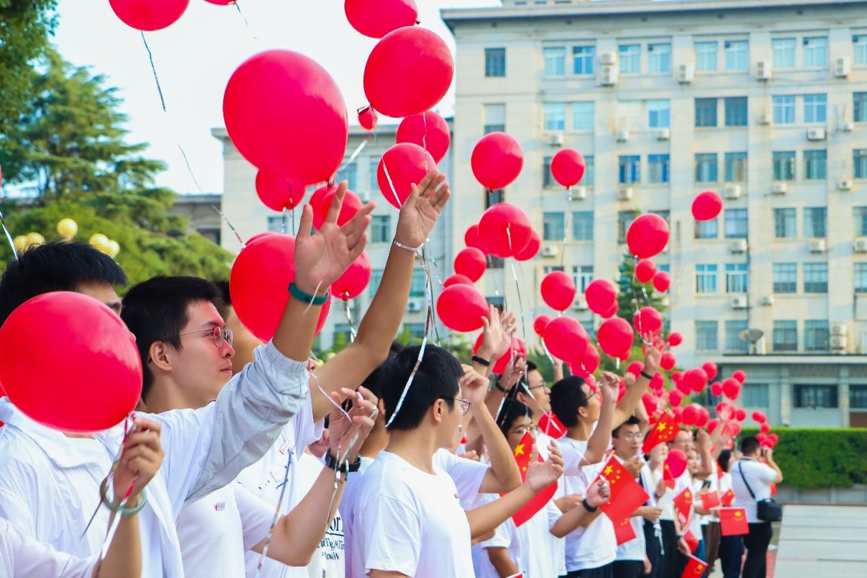 师生在南一门广场放飞520只带着“中国红”色彩的气球,祝愿祖国繁荣昌盛。