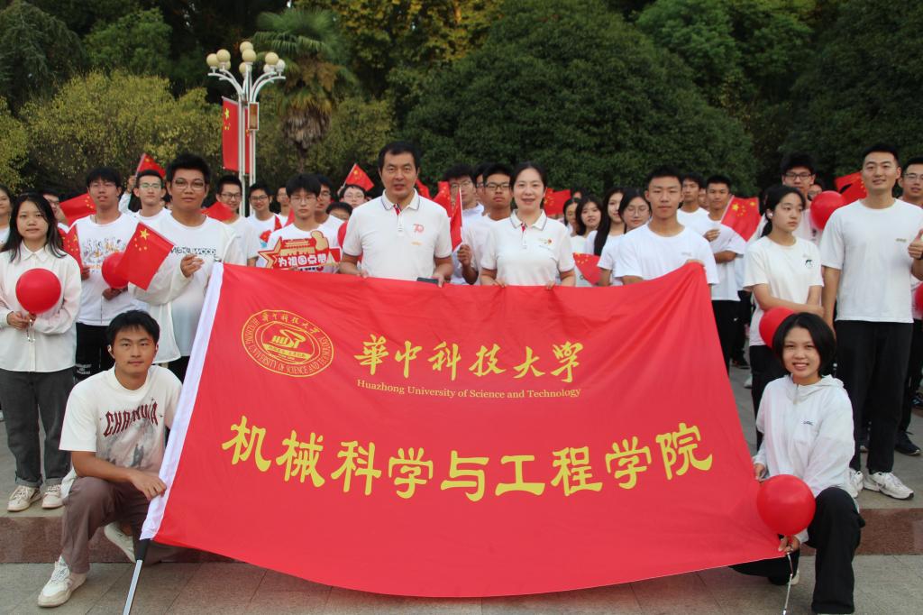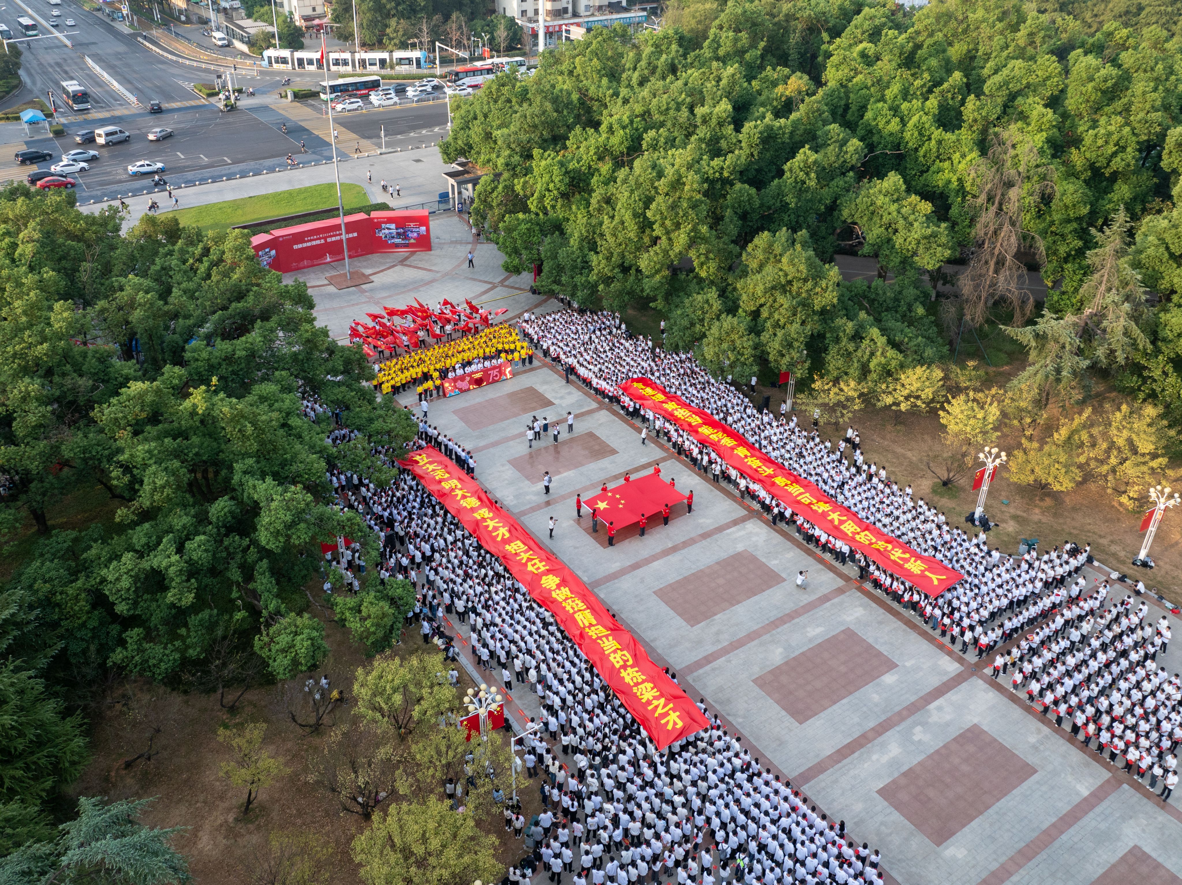 从空中俯瞰,广场中间拉起一面巨幅国旗,“立大志,明大德,成大才,担大任,争做挺膺担当的栋梁之才”和“有理想,敢担当,能吃苦,肯奋斗,勇当可堪大用的时代新人”两幅横幅在员工队列中徐徐展开,激励着全体华科大学子立报国强国大志向、做挺膺担当奋斗者。