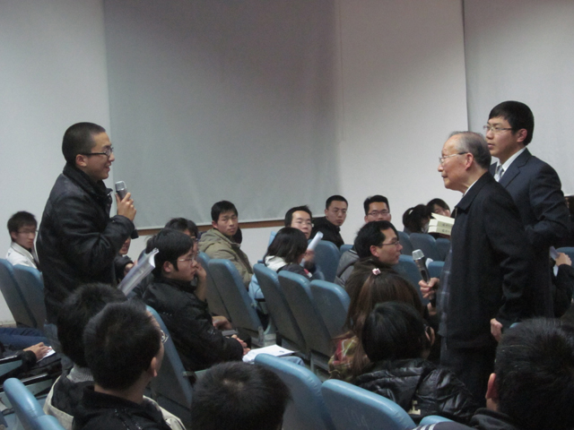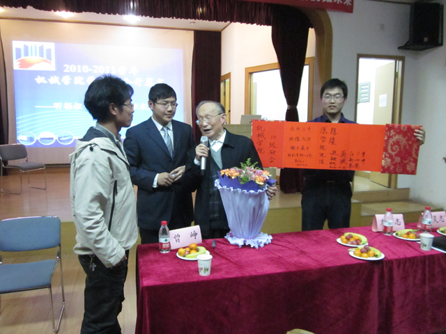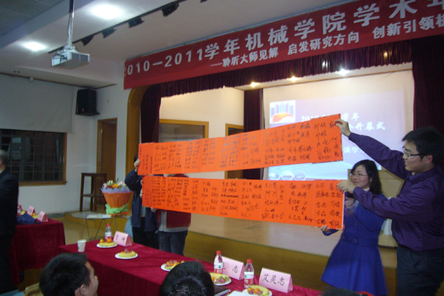 现场进行了积极热烈的互动,杨院士对“如何去除浮躁静心搞学术”、“应如何去思考研究生的研究方向”、“研究生生活要怎样去安排”等问题进行了精彩耐心的回答,如“有电的时候就学习,没电的时候就思考”。杨院士还将数本新近出版的文集《杨叔子教育雏论选》逐一签名后送给同学们,并以“击水三千、扶摇九万,明天属于我们年轻一代”殷切寄语与勉励,近两百名同学也在条幅上联合签名,表达了对先生的感激与祝福。