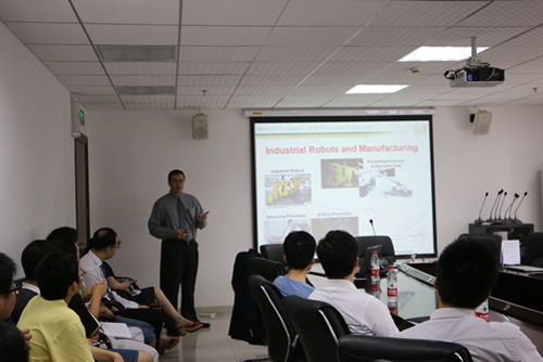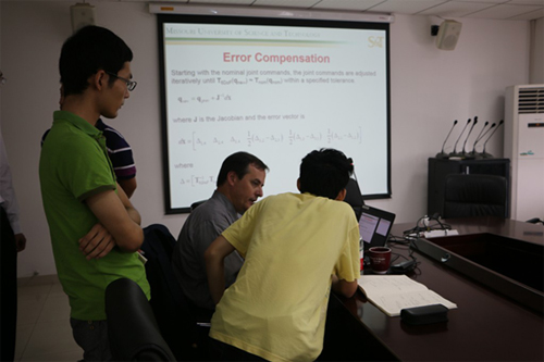 报告会上,Robert G. Landers 教授首先简单介绍了密苏里科技大学基本情况。随后结合其最近的研究进展详细讲解了大型机床和工业机器人的误差补偿研究,通过激光跟踪仪测量机床或机器人的几何误差,再利用基于最大似然估计的隐式循环法确定几何误差模型系数,优化算法以补偿机床误差或用逆雅可比方法对机器人命令进行修正。报告结束后,他与在场师生就相关问题进行了深入讨论。