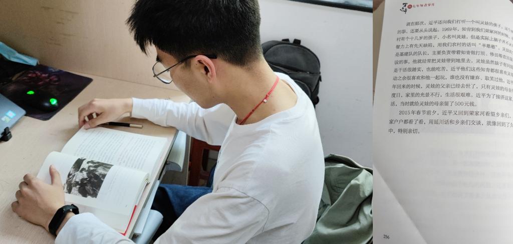 吴宇同志在近一个月,用闲暇时间阅读了《习近平的七年知青岁月》,深有感触,原来习总书记青年时期的经历是这么的接地气,在陕北放羊、铡草、拉煤、拦河、打坝,做的农活比自己这个农村出身的小伙子都多。除此之外,习总书记青年时期好读经典书籍,在七年知青岁月阅读了大量马克思主义经典著作,军事、国际政治、中外历史哲学经典著作,中华传统文化经典和外国文学名著。当年上山劳动,习总书记带着书利用劳动间隙读书;晚上吃饭,嘴里吃着饭,眼睛盯着书。在当时那么艰苦的环境下,习总书记都能够坚持读书学习,现在我们的环境这么好,网上阅读资料很容易就能够获得,却很少去阅读一些经典书籍,这种艰苦好学、苦中作乐的精神十分值得学习。