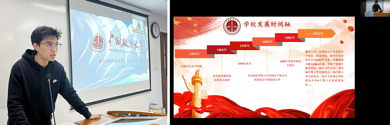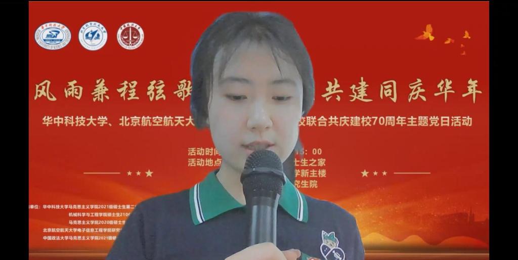 法大21级硕士党支部书记贾燿荣介绍了支部的基本情况。他重点介绍了目前支部正在进行的特色活动——“半月谈”,该活动锻炼了同志们的文笔,强化了支部的向心力,培养了同志们对支部的信任感。他希望在未来的共建活动中,华中大和北航的同志们能一起加入进来,以文会友,进行更深层次的思想交流。他强调,七十年沧桑峥嵘,七十年砥砺前行,我们从历史中走来,现在要向历史更深处进发,希望我们能在联合共建中得到成长,更希望我们能够早日在线下相聚,畅谈美好理想!