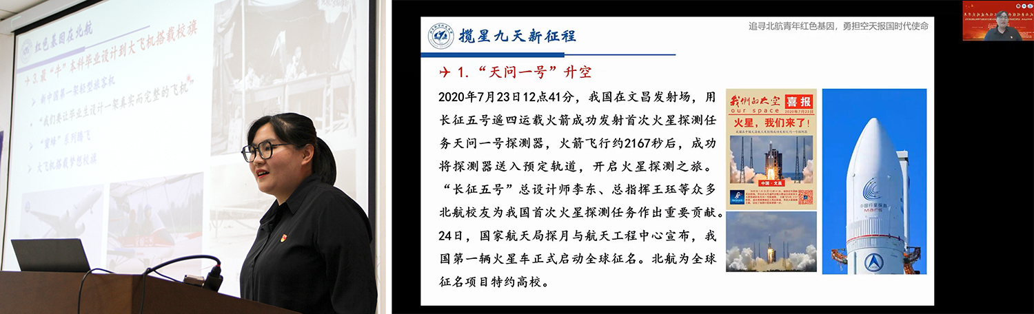 北航习近平新时代中国特色社会主义思想研究生宣讲团讲师杨苏凡同志带来了题为《追寻北航青年红色基因,勇担空天报国时代使命》的宣讲,她以天问落火为切入点,阐述了我国航天事业面临的机遇和挑战,讲述了历代北航优秀青年为祖国空天事业做出贡献的故事。最后,她结合《习近平谈治国理政》第三卷,和《新时代中国青年》白皮书解读,为大家解读了新时代北航精神和青年责任,勉励大家立足新时代新征程,肩负起新时代北航青年的责任,传承空天报国精神,将个人的小我融入国家的发展的大我之中,努力成长为堪当民族复兴重任的时代新人!