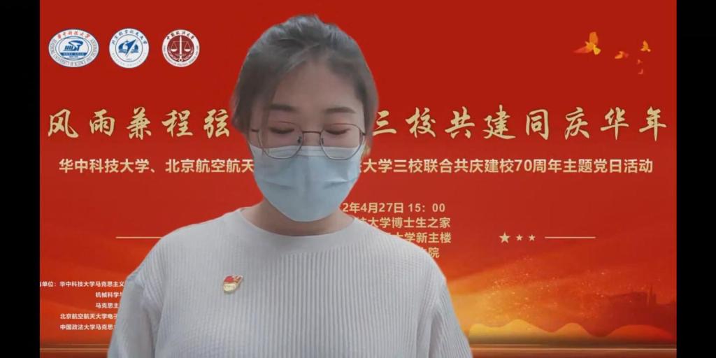华中大马克思主义公司2021级硕士生第二党支部的支部书记张悦简述了整个活动从酝酿到成熟的过程,对两所高校的积极配合表示由衷的感谢。她希望三校能够以本次活动为起点,发挥好三校各自优势,未来在学术科研、党建工作等方面开展更多学习交流活动,共同携手开创三校发展新征程,也希望日后能够和北航与法大的同志们在华中大进行线下交流。
