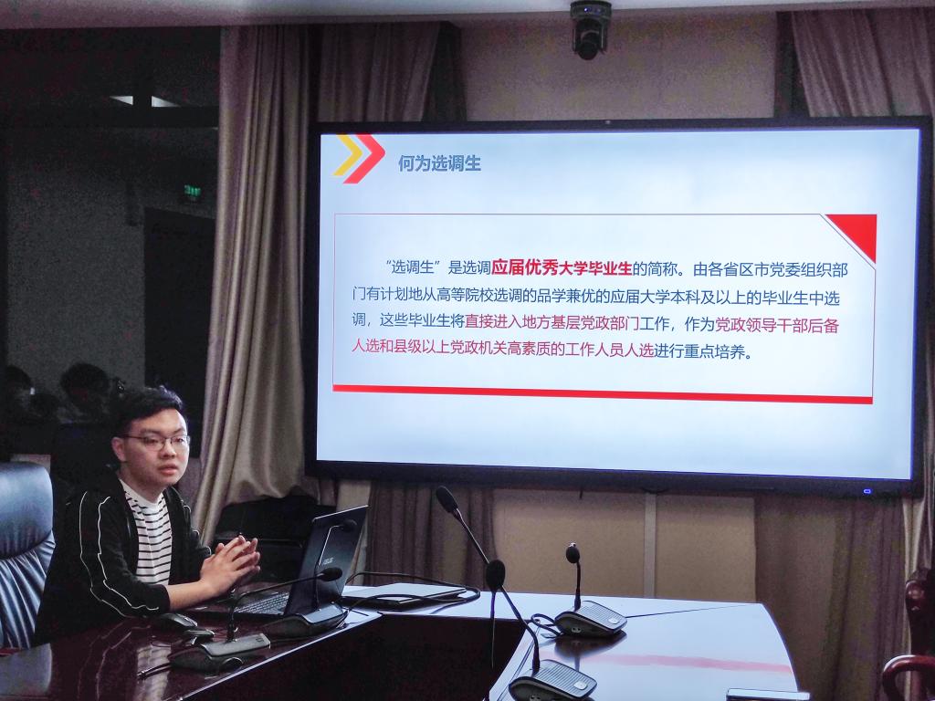 为更好地帮助本支部同志全面、深入了解选调生政策,科学合理地准备选调生考试;培养扎根基层、服务人民的意识;更好地教育引导全体同志在学思践悟中坚定理想信念,在奋发有为中践行初心使命。4月28日晚,公司硕士2004党支部特在招聘季来临前开展“走进选调生”活动,邀请了华中老员工基层治理研究会选调生政策学讲团讲师王英杰同学担任主讲,由党支部书记滕钺主持。公司党委副书记段政及支部40名党员参与了活动。