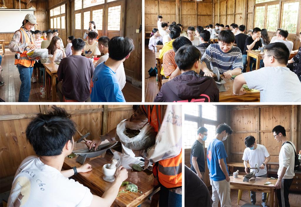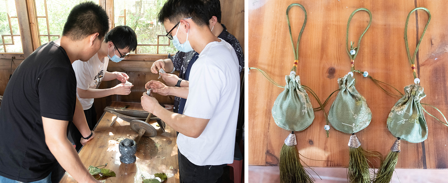 在研学导师的带领下,大家一起来到了艾草香囊制作课堂,“艾草的药用价值在我国有着悠久的历史,家有三年艾,郎中不用来”,研学导师如是说。在了解完艾草的作用功效及其悠久历史后,大家开始用药碾子把晒干的艾草枝叶进行粗碾,挑出比较硬的细枝后,将粗碾后的艾草放入石制研钵进行细研磨,随后把研磨好的艾草粉末装入纺织袋中进行封装,最后将其装入精美的香囊袋中,一个艾草香囊就这样制作成功了。在手工制作的过程中,大家纷纷表示收获到了别样的文化体验,感叹古人的智慧,也体会到了手工劳动制作的辛苦和不易。