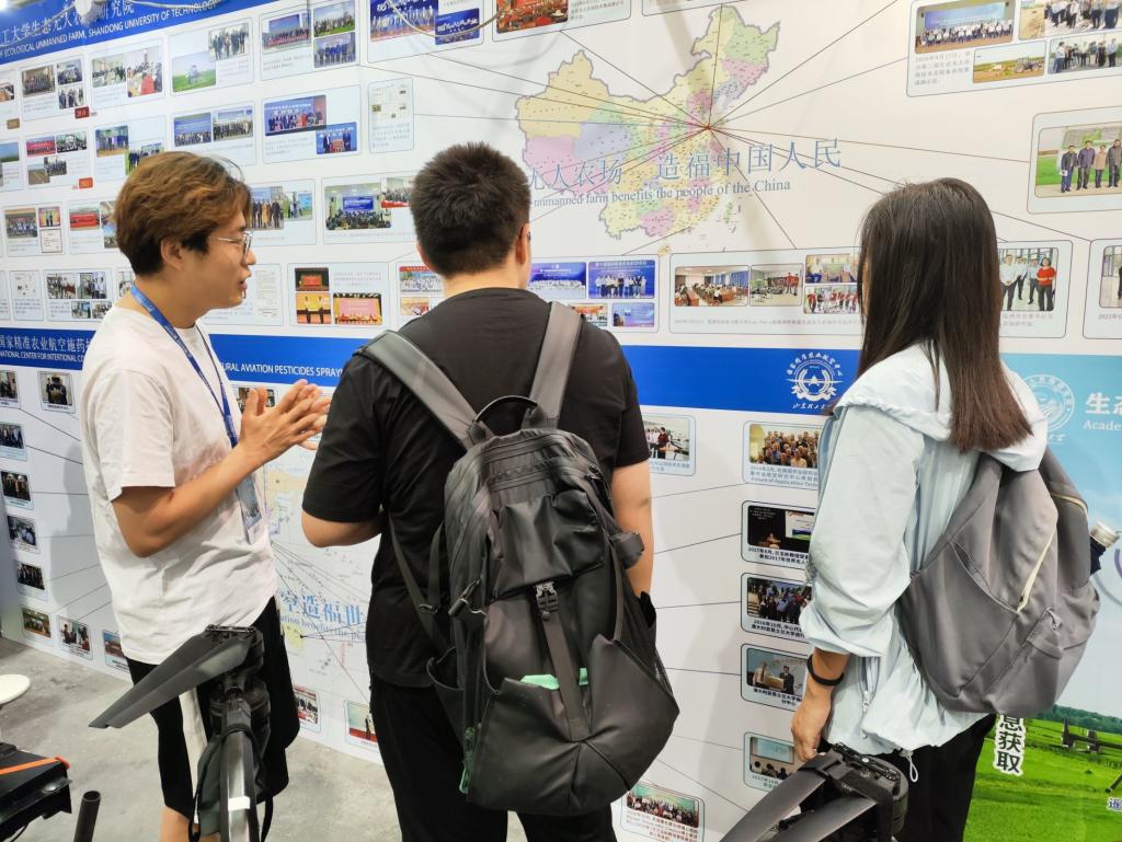 在会上,实践队有幸与两个研究院的科研团队深入交流,山东理工老员工态无人农场研究院在智能化生态无人农场的研究中取得很大进展。生态无人农场追求“天-空-地”一体化农田信息获知,针对耕种管收实现全过程无人化作业,力图实现高效生产。