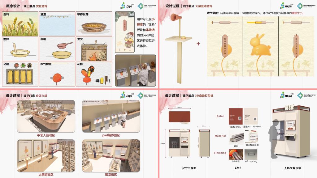 该作品是基于人工智能的天门糖塑非遗文化创新体验服务设计,涵盖了品牌配套小程序、交互游戏、店铺构造、体感装置及产品建模多方面的设计。作品的特色在于用户可通过交互游戏在移动端了解糖塑制作的全流程,并使用体感装置虚拟体验糖塑的捏塑过程,同时,还可以将捏塑成果打印出来留作纪念。团队设计该作品,旨在缓解糖塑发展困境,助力文化活态传承。