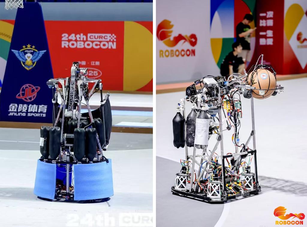 本届“飞身上篮”赛项从篮球比赛过程中汲取灵感,将传统篮球运动的竞技魅力与机器人技术的智能化相结合,延伸出两个机器人的任务。实际比赛过程中,红蓝方两队各操控两台机器人在比赛场地进行篮球对抗,目标是通过运球、传球、投篮、扣篮动作得分并防守己方篮筐。在双方争分夺秒的攻防下,比赛紧张激烈。HUSTROBOCON团队制作的机器人以全胜的战绩以小组第一的身份冲出小组赛,并相继战胜北京航空航天大学、青岛理工大学等实力强劲的队伍晋级总决赛,最终在与老牌强队太原工业公司的对攻大战后结束了本赛季的征程。在赛场上,两台机器人稳定的运球、精准的传射以及机械臂机器人的投篮、盖帽、扣篮动作引得观众的连连喝彩。凭借创新仿生机械臂篮球机器人,团队得到了机器人篮球最佳技术奖。