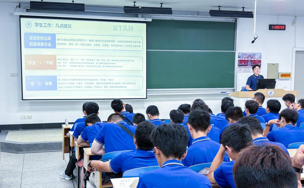 2022级本科生汪杰作为退伍老员工、“自强之星”的优秀代表,为新生作了一场关于蜕变与超越的分享,从部队的“绝对服从与集体至上”谈到重返校园后自主规划与自我驱动的课业攻坚,从军旅生活中永不放弃的精神延伸到科研竞赛中直面挑战、精益求精的执着追求。他融合了军旅锤炼的钢铁意志与学术科研的探索精神,诠释了自强的内核。
