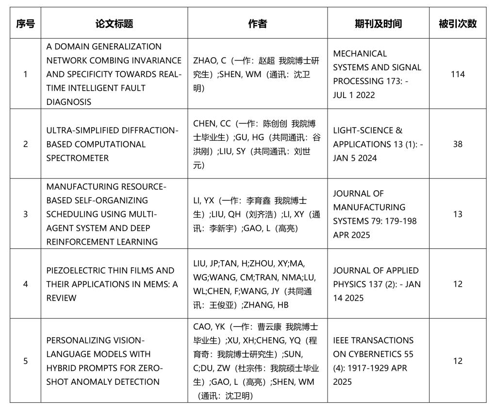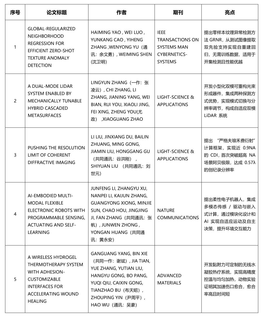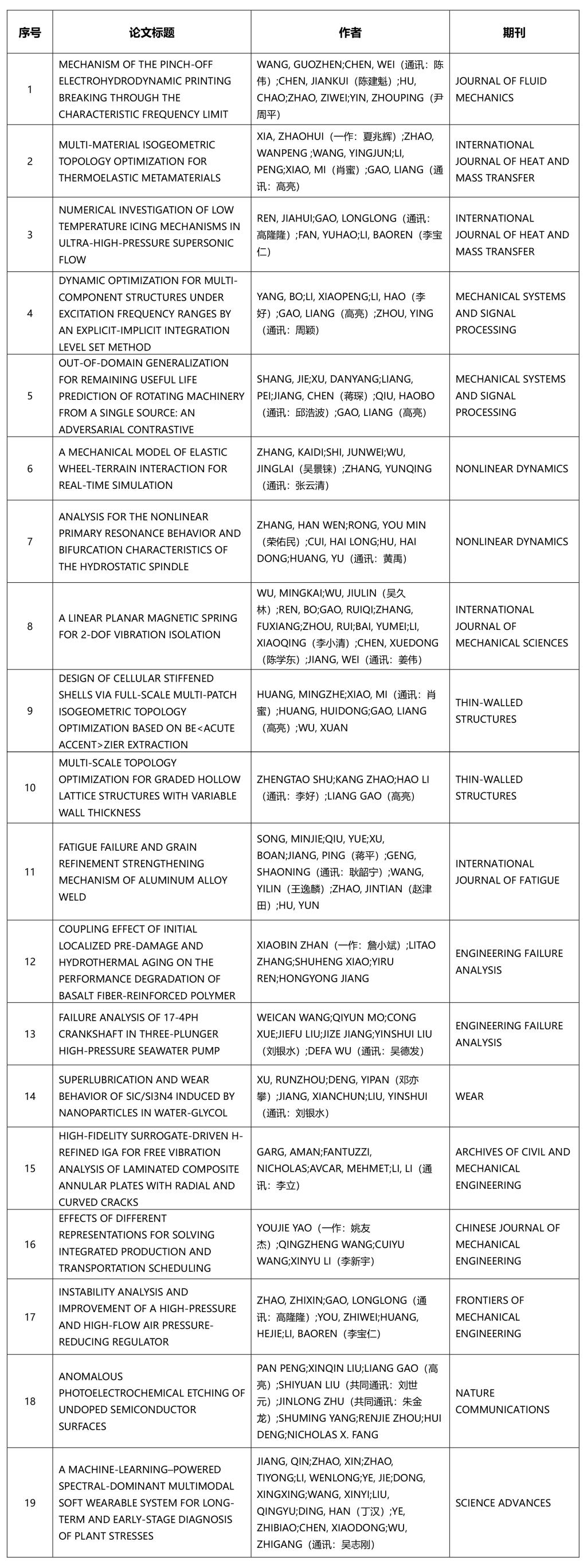 公司以非第一单位发表论文5篇,其中2篇(贺松平、毛新勇;陈伟)发表在MECHANICAL SYSTEMS AND SIGNAL PROCESSING;1篇(张超勇)发表在CHINESE JOURNAL OF MECHANICAL ENGINEERING;1篇(黄永安-共同通讯)发表在NATURE COMMUNICATIONS;1篇(李鹏、肖蜜)发表在SCIENCE ADVANCES。
